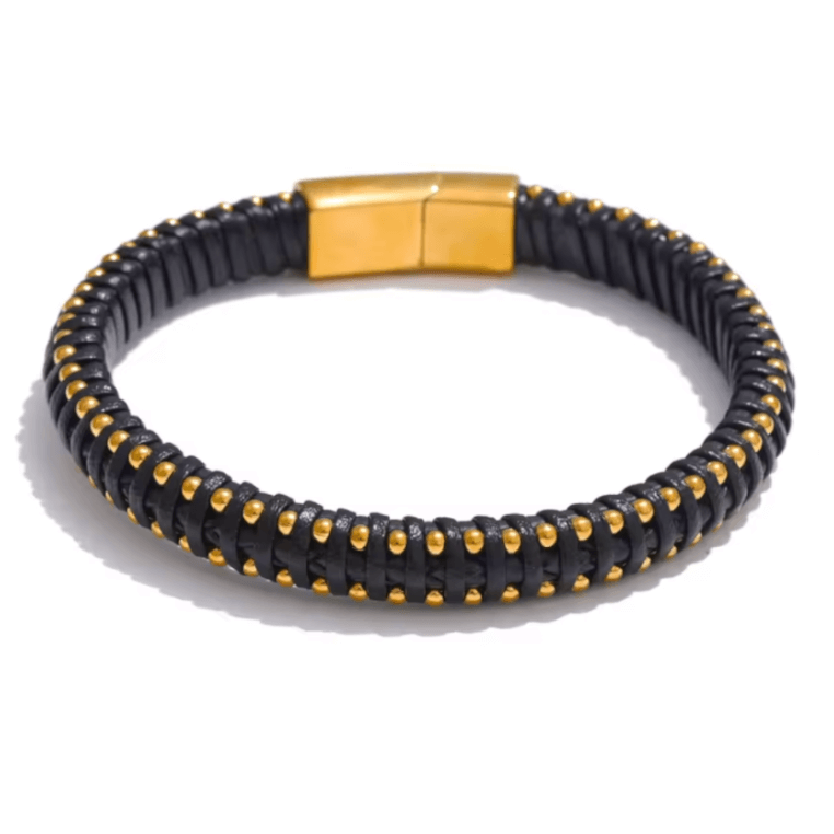 This striking bracelet is made up of multiple strands of black PU leather interlaced with Gold beads.
