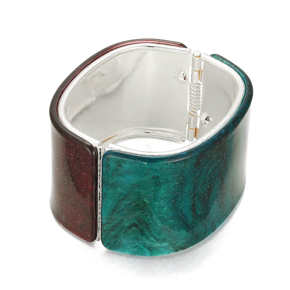 This striking cuff bangle uses gorgeous deep green and purple shades of acrylic to great effect. The colours have a swirly marbled effect and a shimmery finish, making them look like a beautiful galaxy of stars.