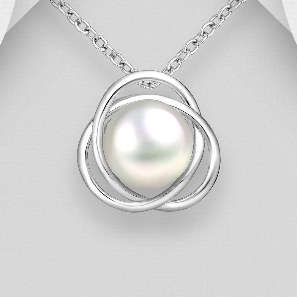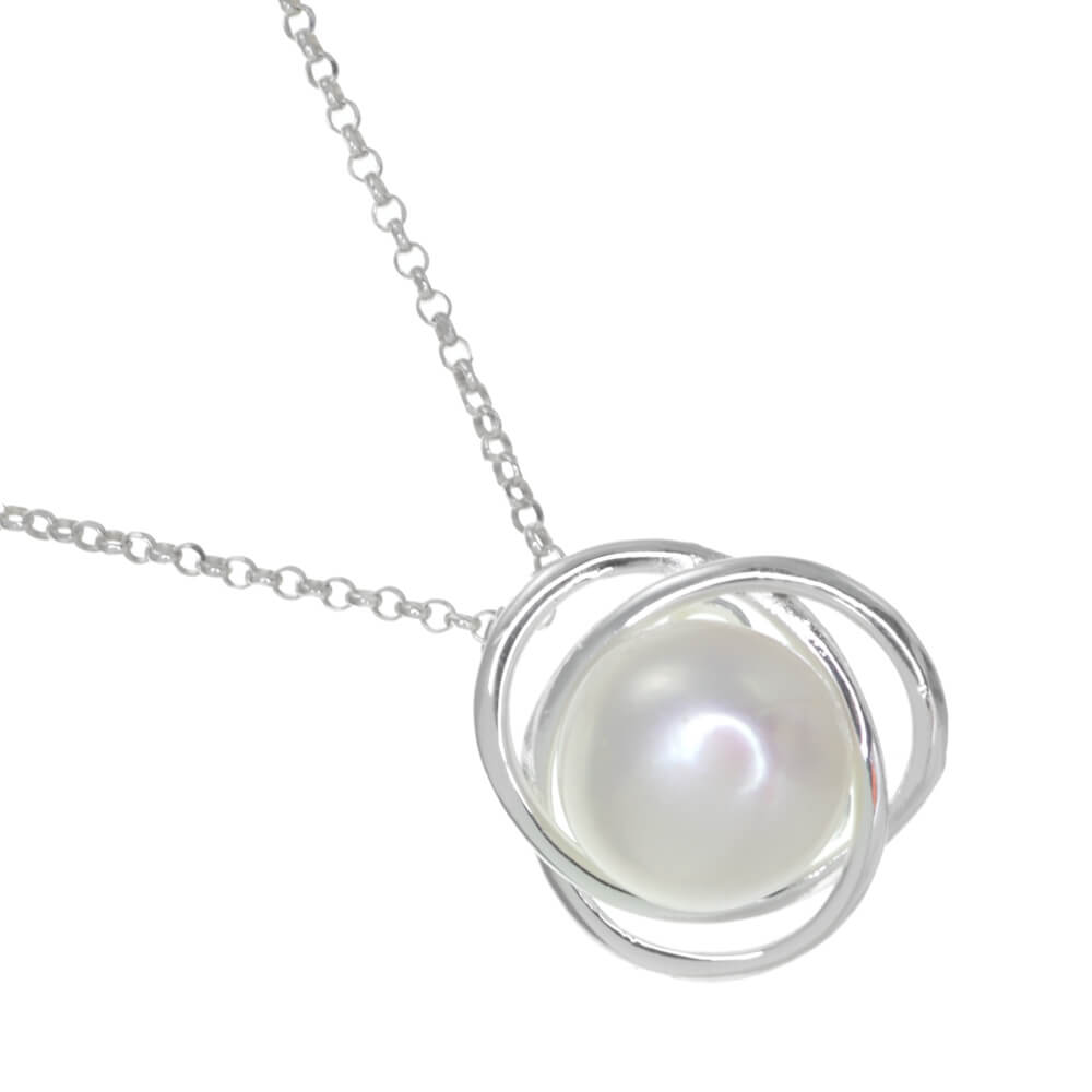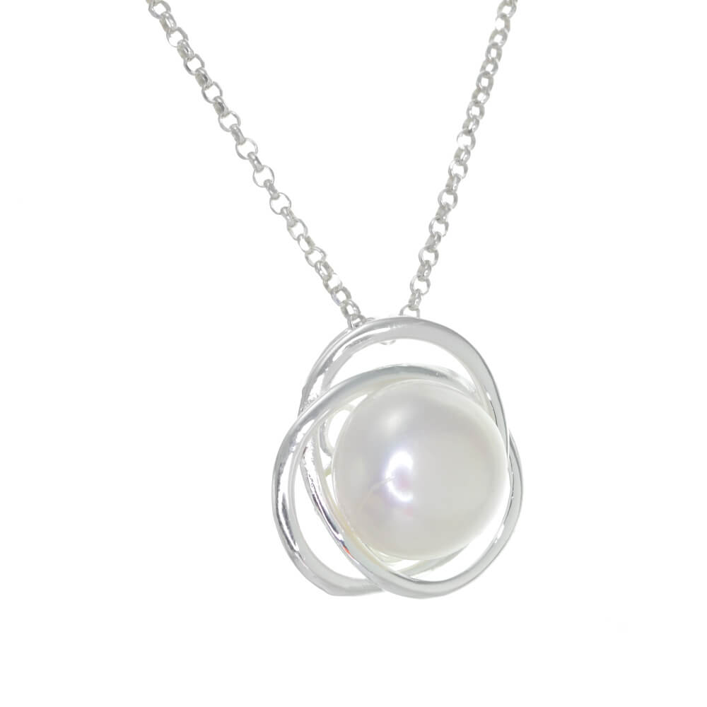 An elegant pearl pendant featuring a round pearl set on a delicate looping design reminiscent of the celtic triquetra trinity knot.