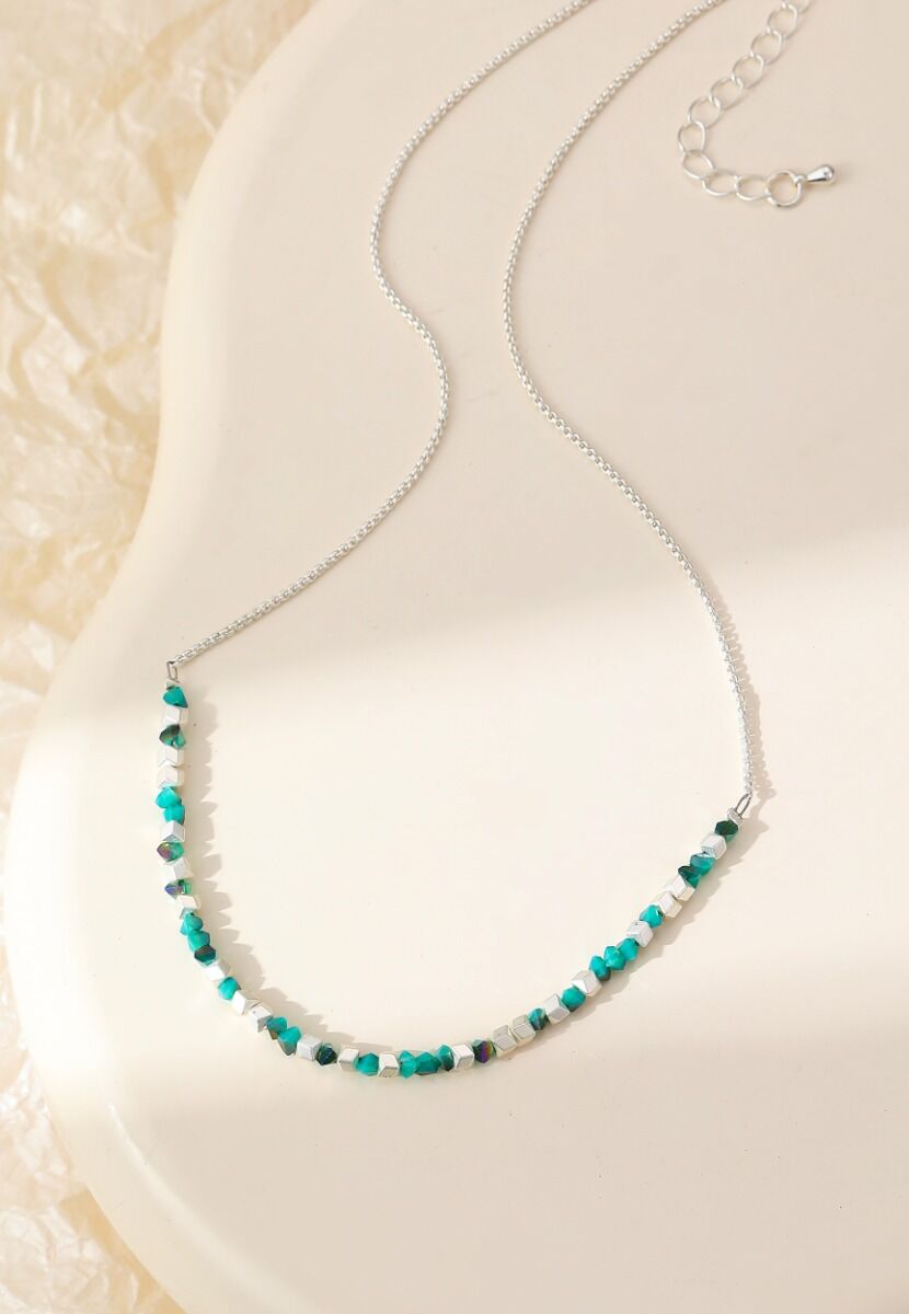 A beautiful necklace with coloured gem chip shaped beads. The gems are lightly iridescent and sparkle beautifully.