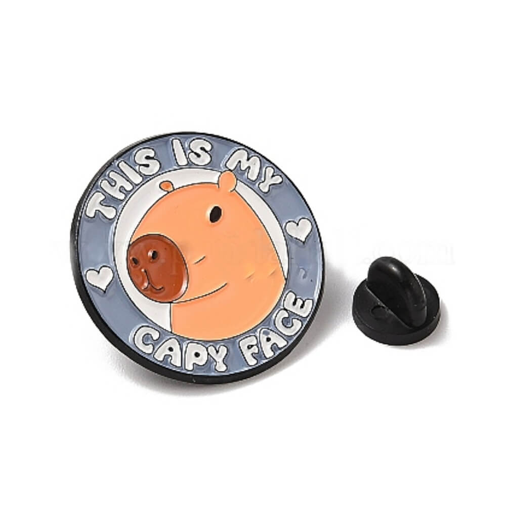 A cute and quirky pin brooch with a capybara face making a pun on ‘this is my happy face’