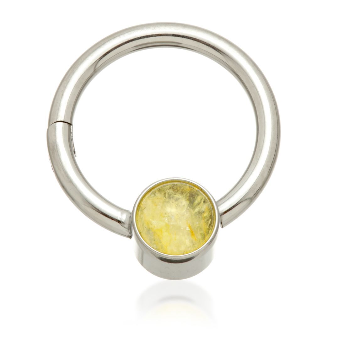A stunning clicker ring in titanium with a gemstone disc. This piece looks especially good in the daith or septum!