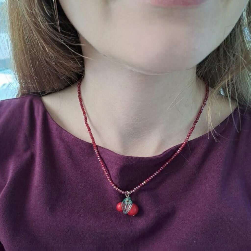 Be the first to review “Cute and Quirky Pink Beaded Necklace with Red Cherries and Leaves Pendant (M290)B)”