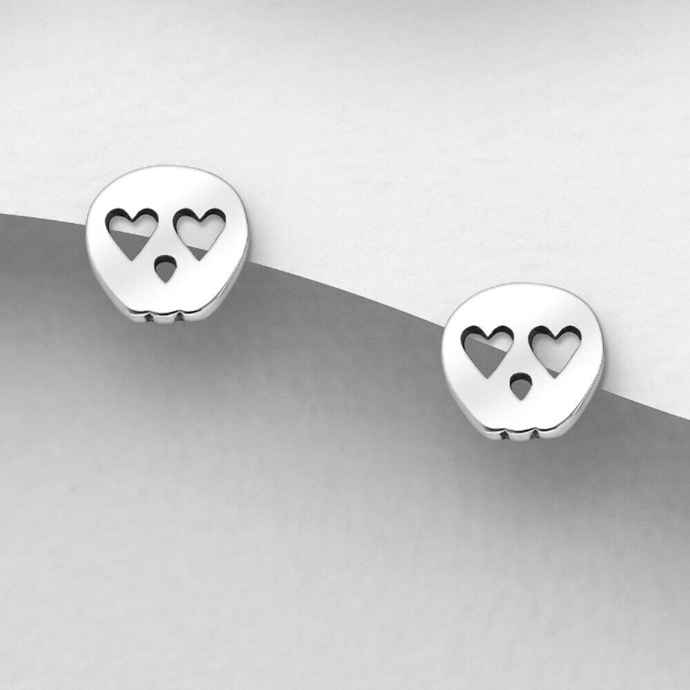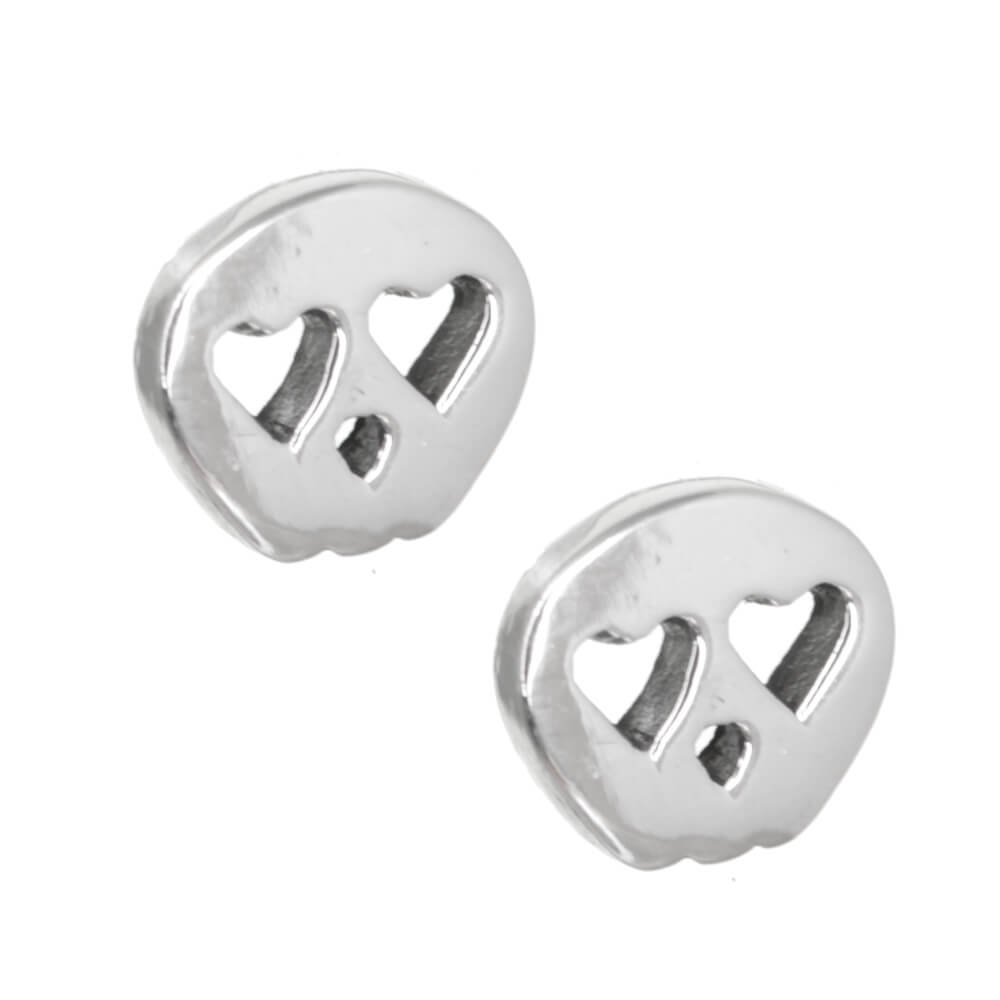 This tiny pair of skull design stud earrings have cut out heart shaped eye details. perfect for goths and lovers of cute jewellery alike!