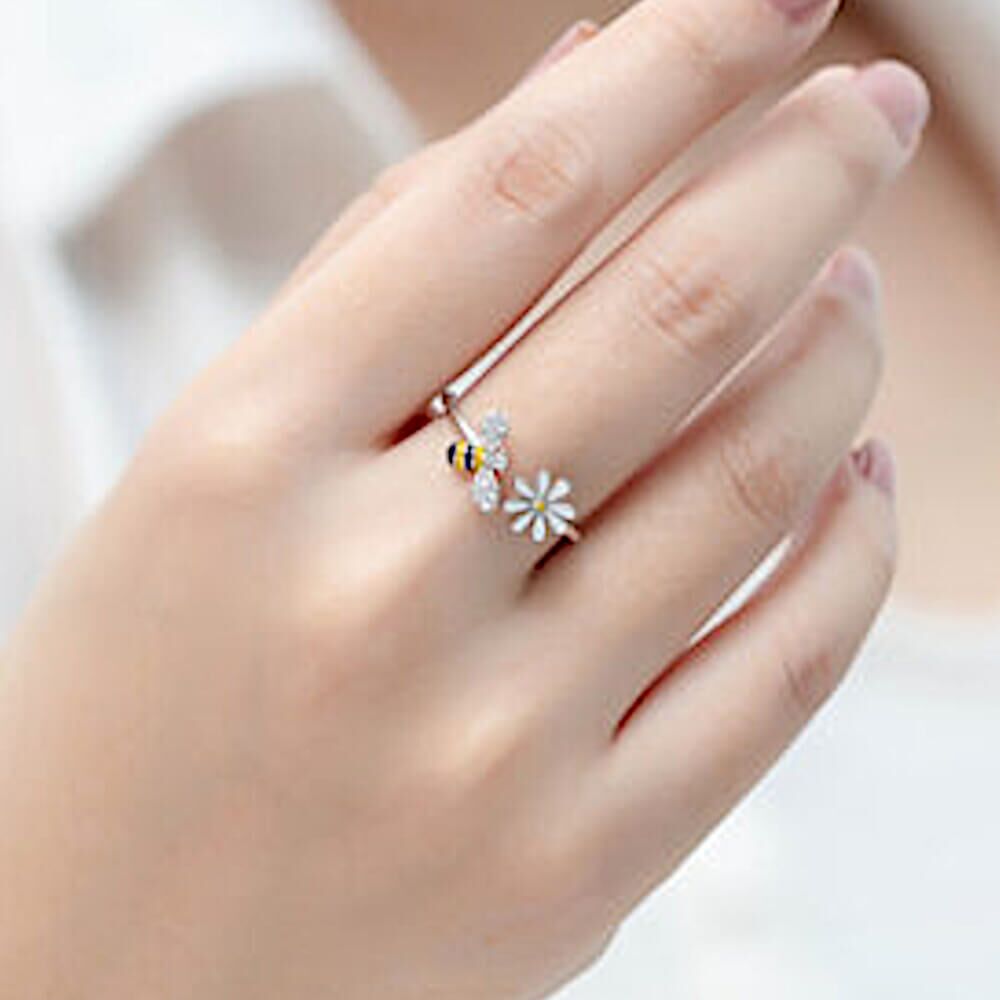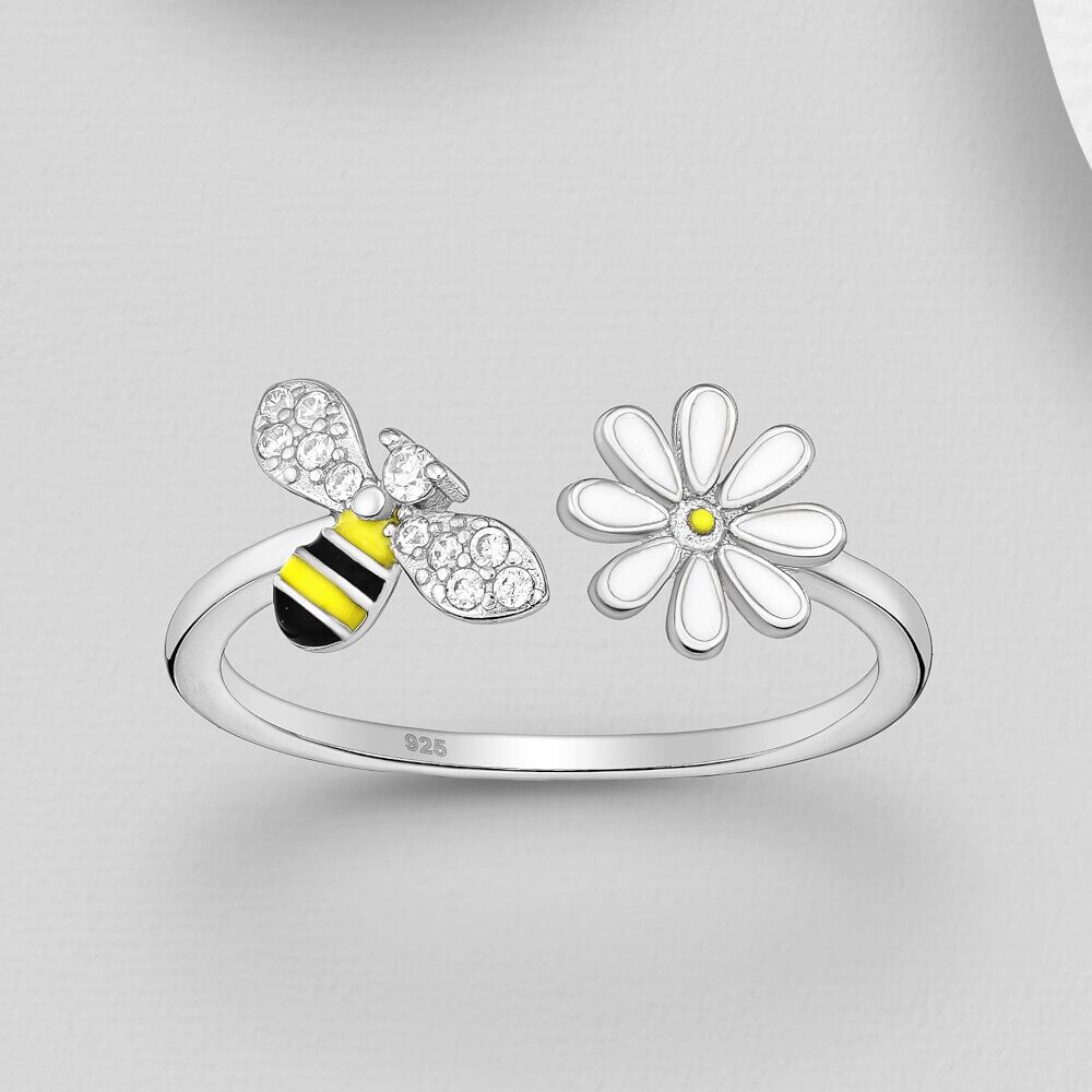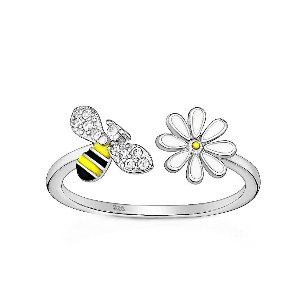 This is a really pretty and dainty ring with an open design. One side features a yellow striped enamel bee, and the other side a white enamel daisy. The bee has sparkly crystal wings.