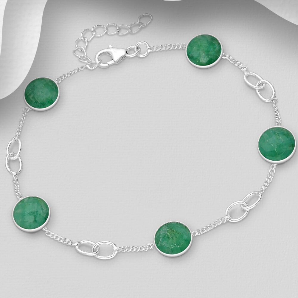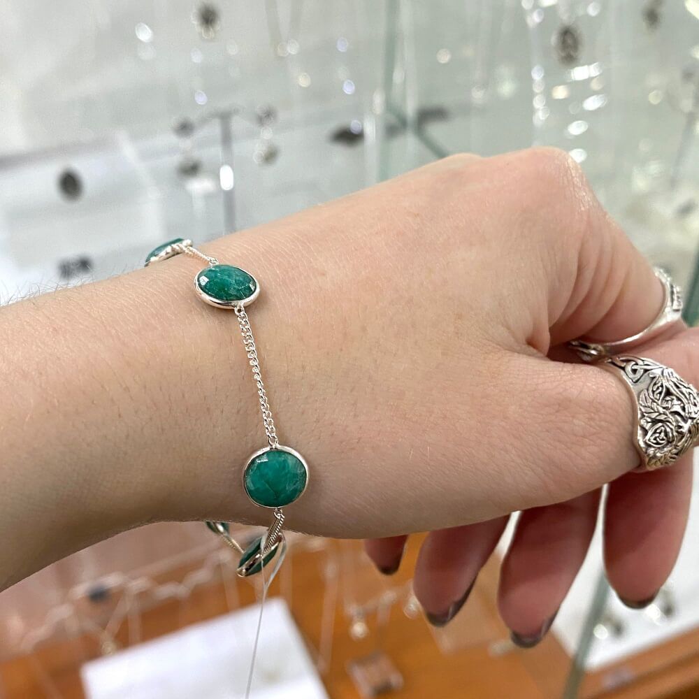 A striking and elegant bracelet with faceted green gemstones and contrasting shiny linked circles.