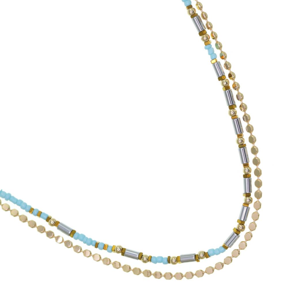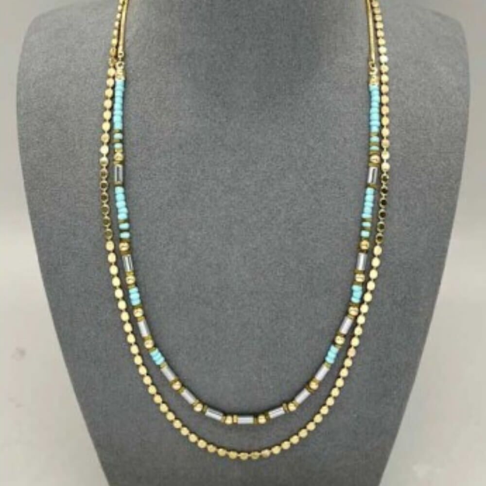 A simple and pretty necklace with two beaded layers, both fairly short. Both layeres have tiny gold beads, and the shorter layer has pastel blue coloured beads as well.