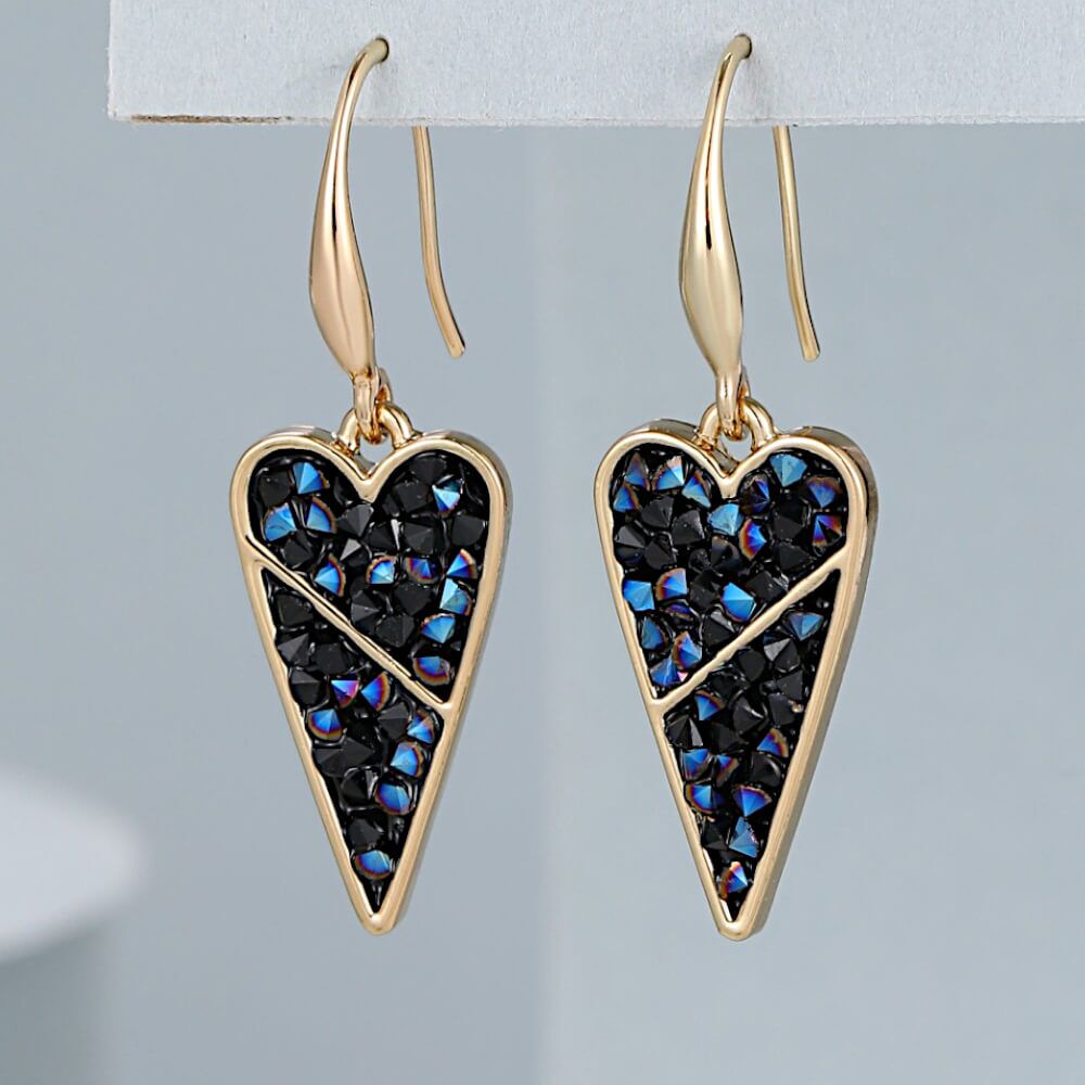 This striking earring features lots of tiny blue crystals which create a quartz-like druzy effect on the surface of the heart shape.