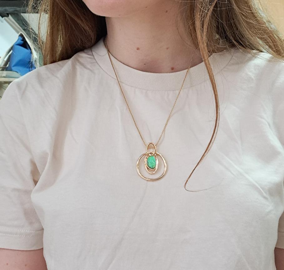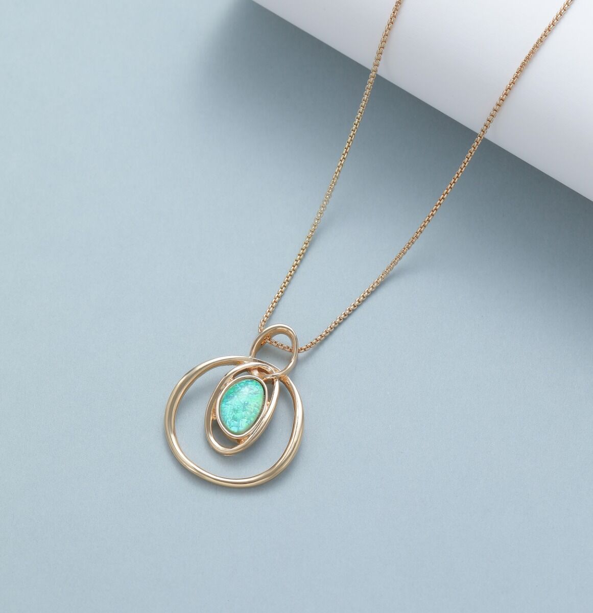 A beautiful pendant featuring an opalescent stone that changes from blue to green depending on the light.
