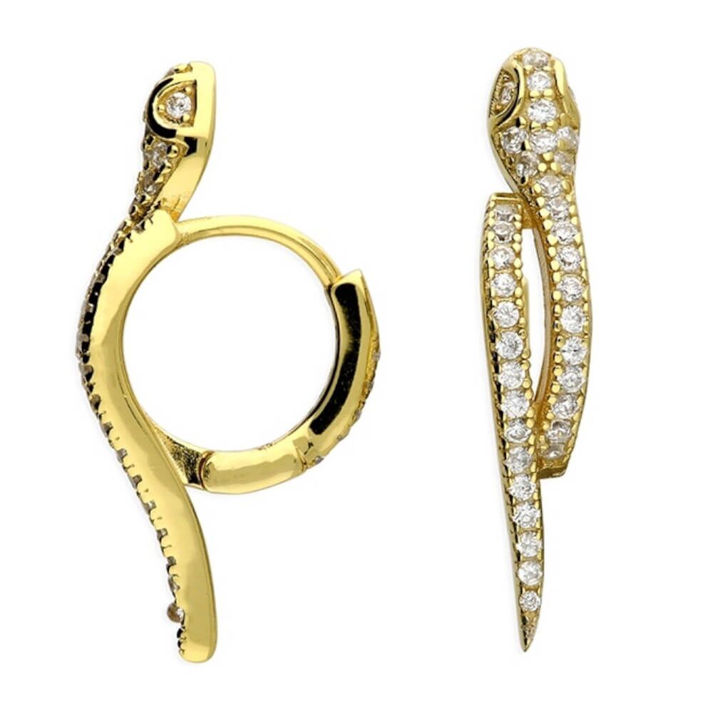 A sparkly and unusual pair of snake themed huggy hooped earrings with a useful and sturdy hinged clip fastening that secures with a click.