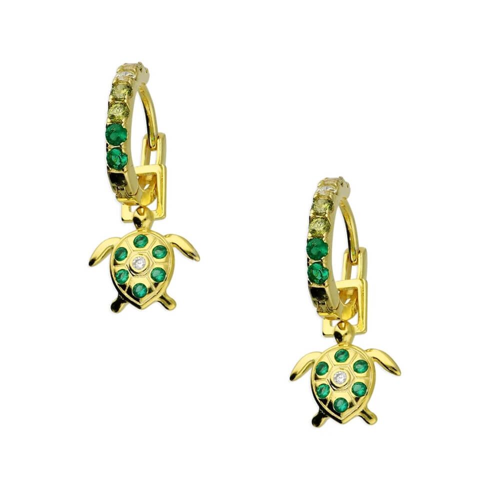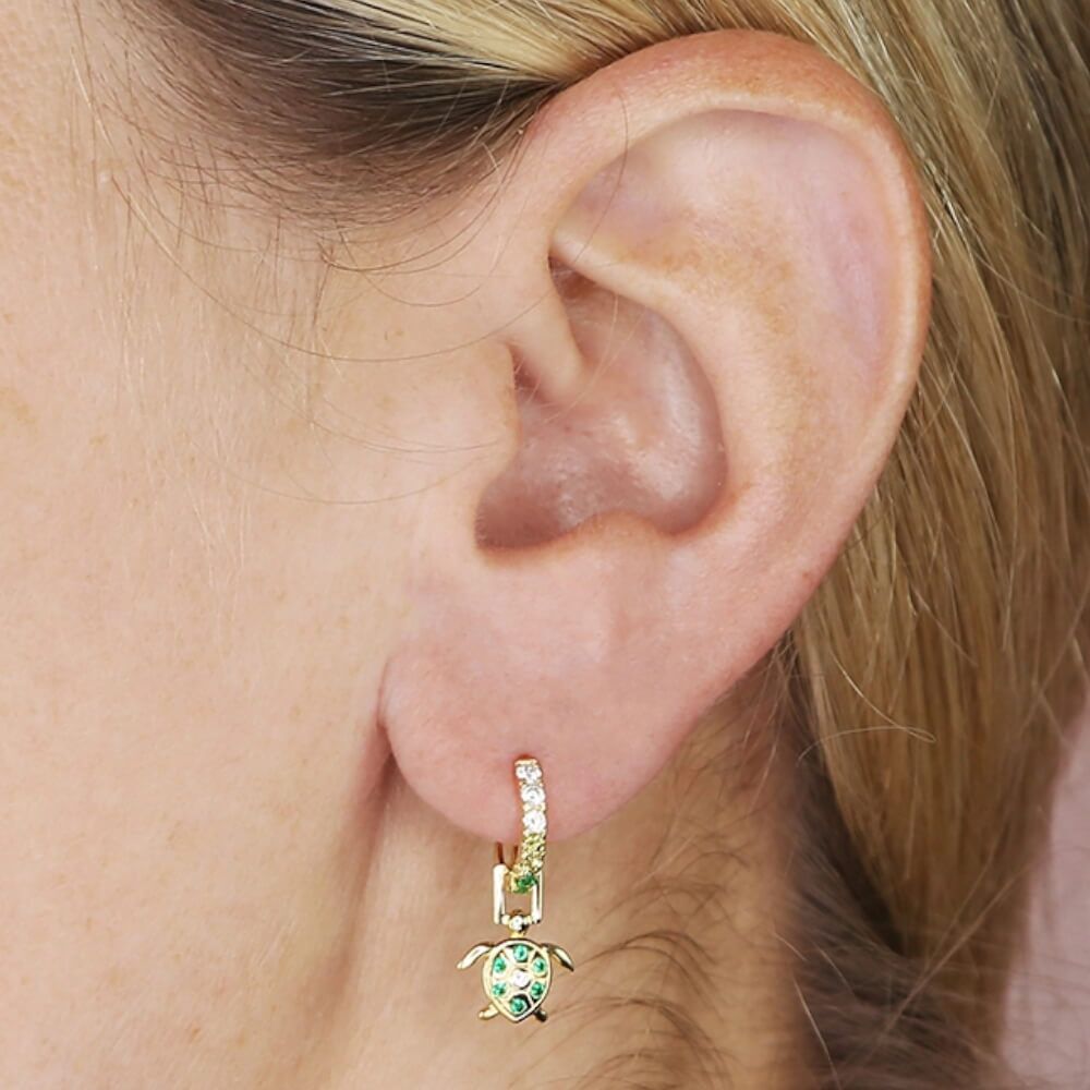 A small and simple pair of huggy hooped earrings with a useful and sturdy hinged clip fastening that secures with a click. This pair features dangly turtle charms and is decorated with green and white cubic zirconia crystals.