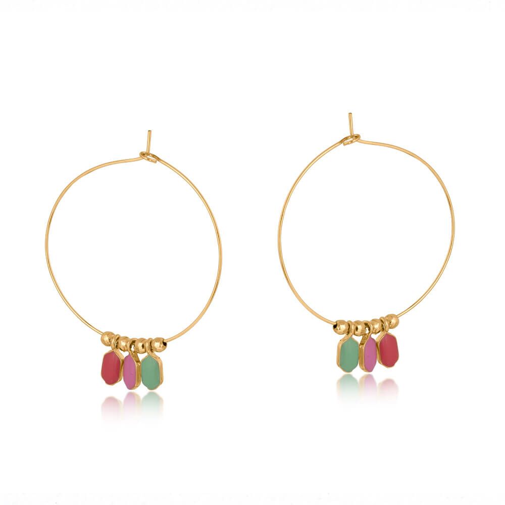 These gold plated drop hoop earrings combine a high-shine finish with colourful details. A beautiful accessory to complete any outfit. At least 50% of the brass we use in the jewellery make is recycled from leftover/overhead brass. All posts are hypoallergenic made from surgical steel.