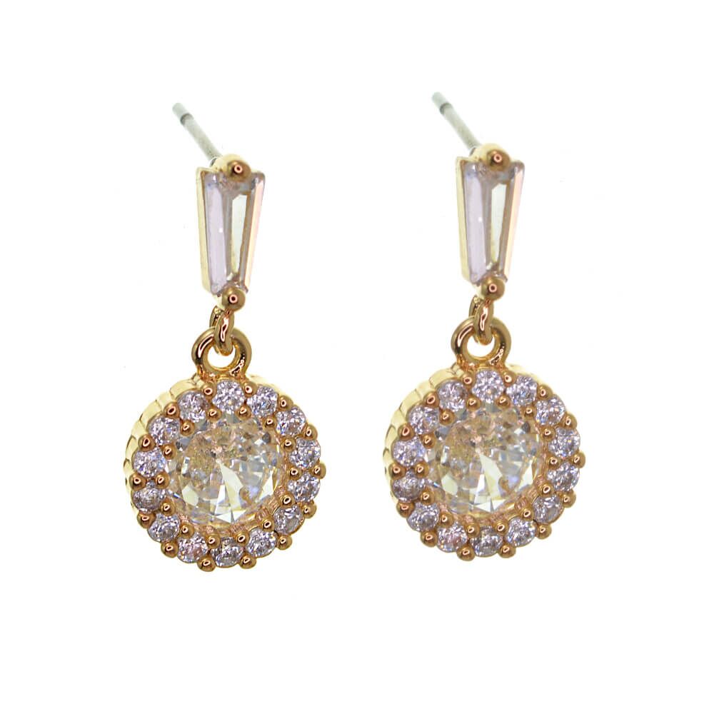 This elegant pair of earrings features many crystals circling a single larger crystal in a halo design. Perfect for dressing up an outfit.