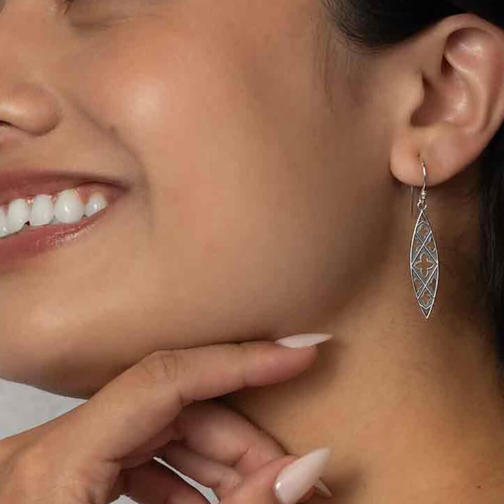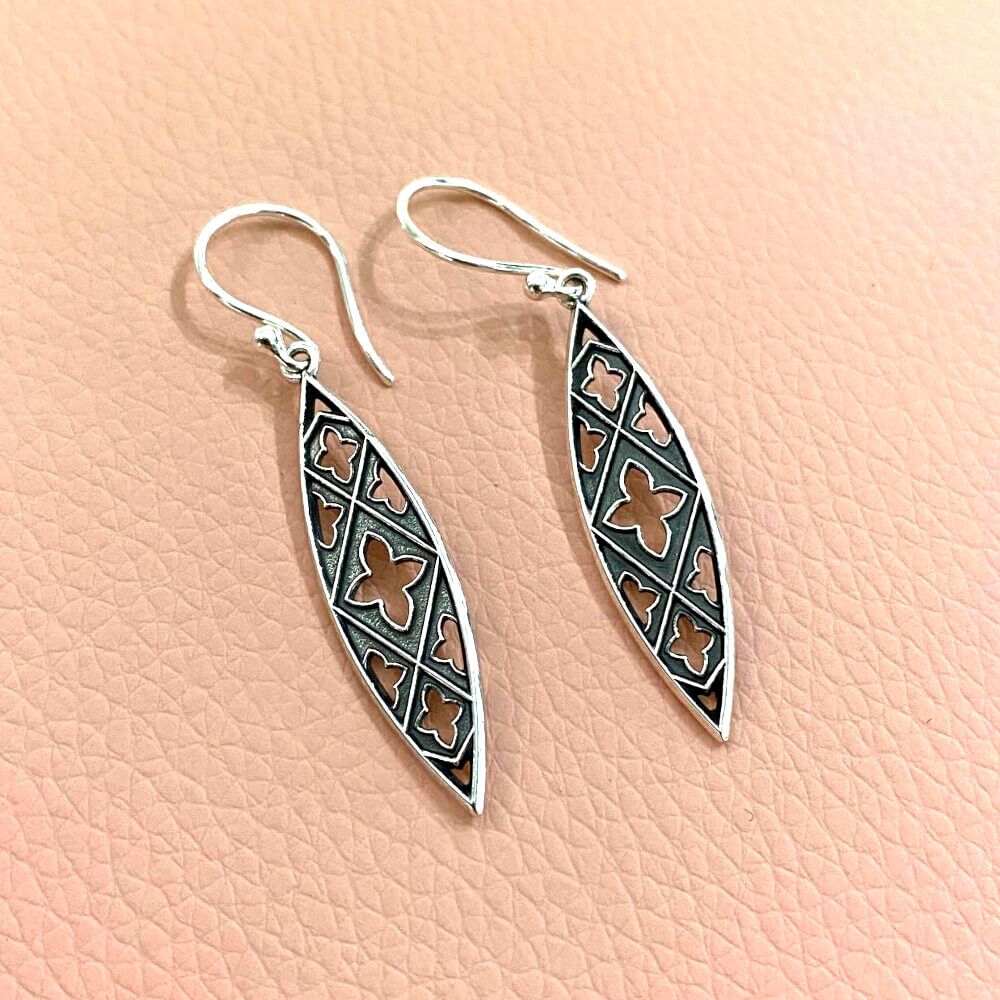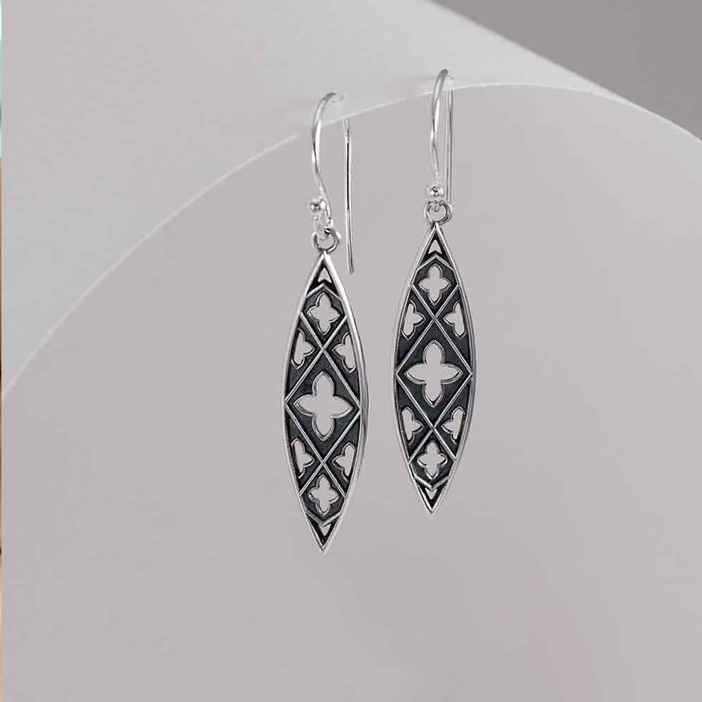 Crafted from sterling silver, this pair of earrings features an elongated marquise shape adorned with intricate gothic-inspired cut-out designs. Symmetrical crosses, evenly spaced along the body, create a mesmerizing pattern against the oxidised background.