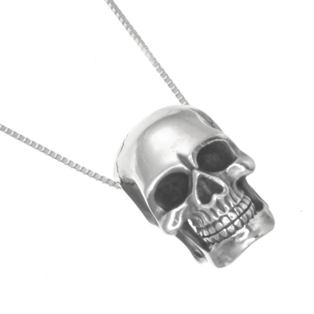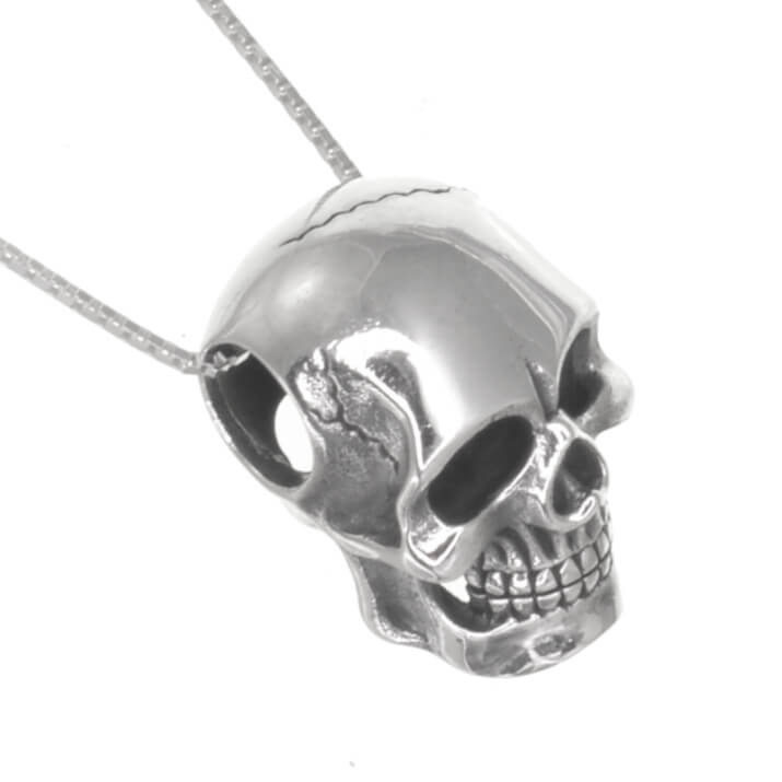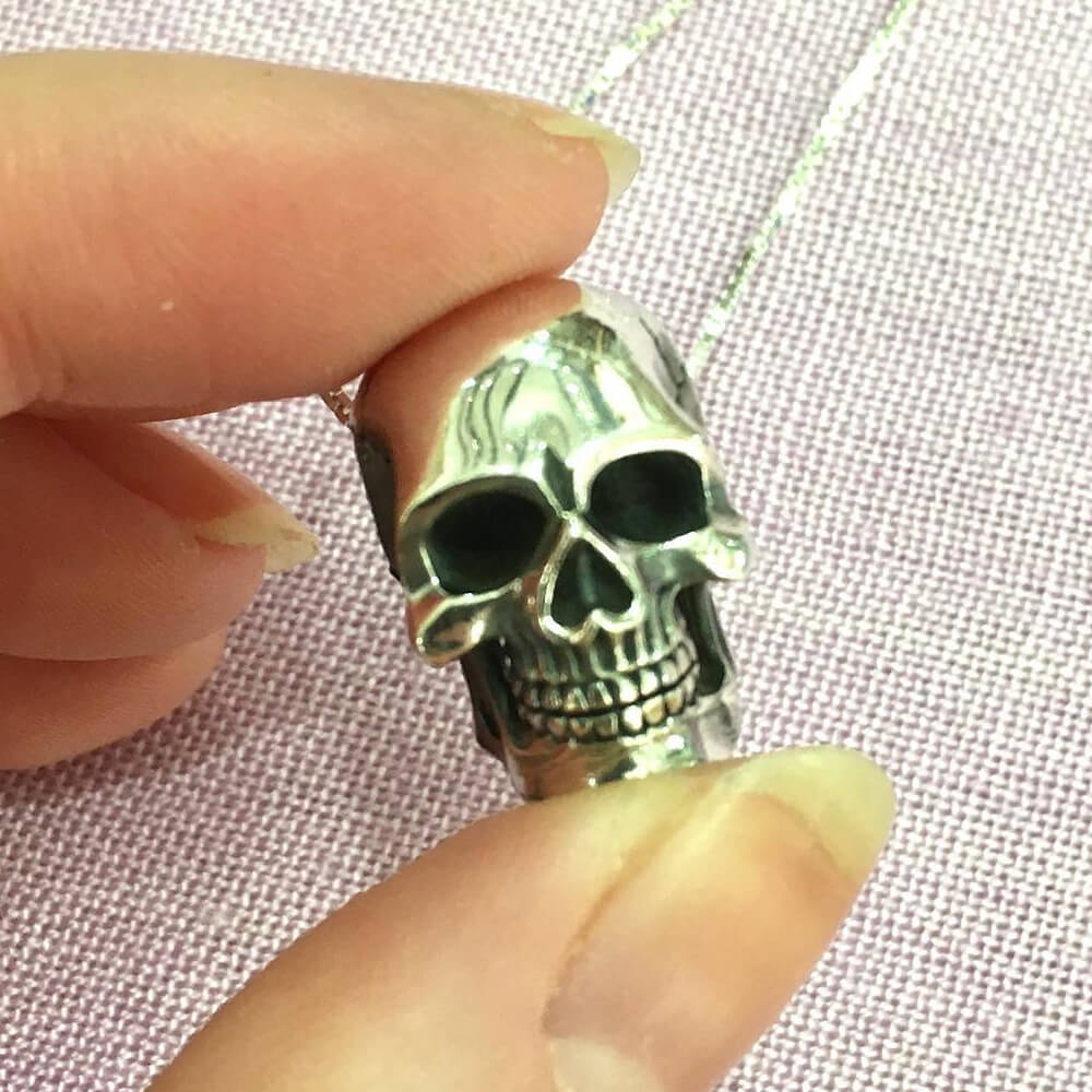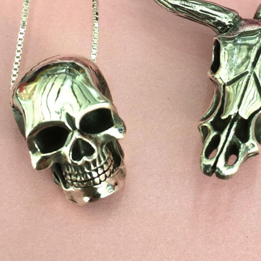 A simple and spooky skull pendant- the pendant is like a bead, in that the chain passes through a hole in the middle of the design. Perfect for every ghost and ghoul!
