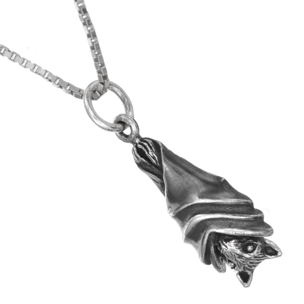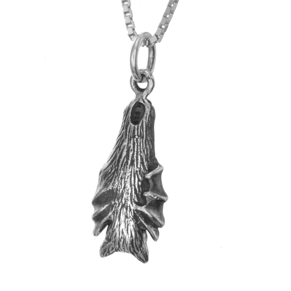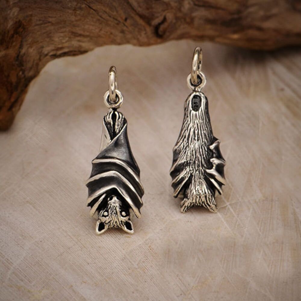Sterling Silver Hanging Bat Charm. With her wings wrapped around herself like a cloak, this little bat is taking a long deserved rest. This bat charm is lovely from all sides – the ribbed wings wrap from front to back, and she has a sweet face with a long nose and pointy ears.