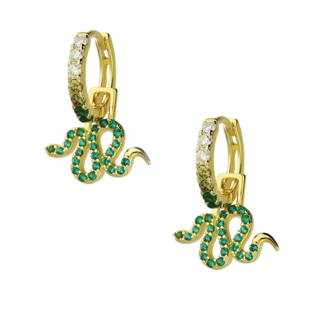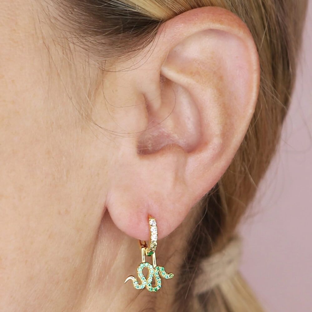 A small and simple pair of huggy hooped earrings with a useful and sturdy hinged clip fastening that secures with a click. This pair features dangly snake charms and is decorated with green and white cubic zirconia crystals.
