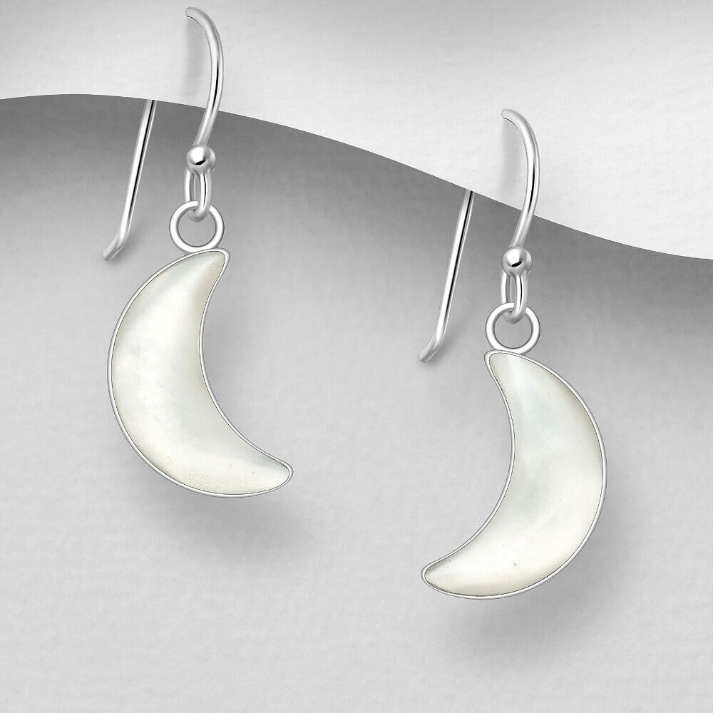 A beautiful and magical pair of earrings featuring natural shell inlaid into a crescent moon shape.