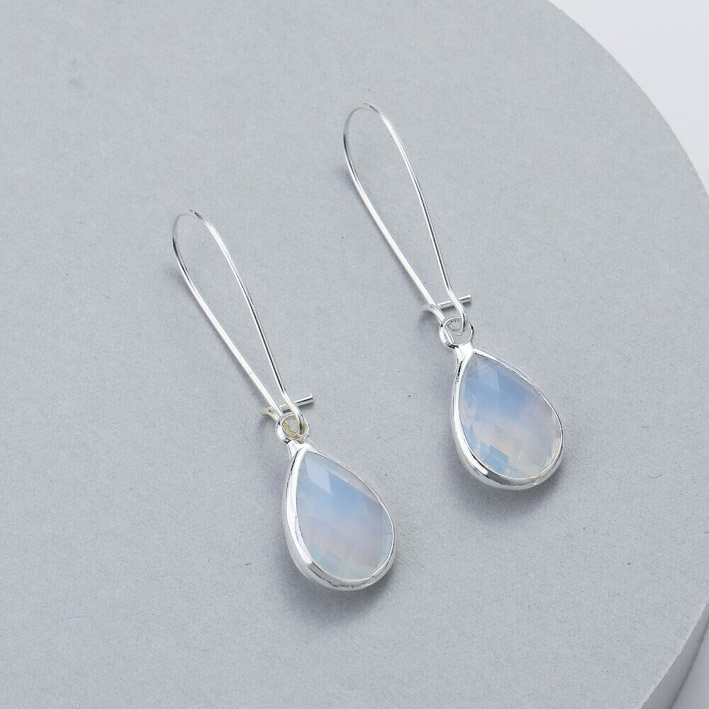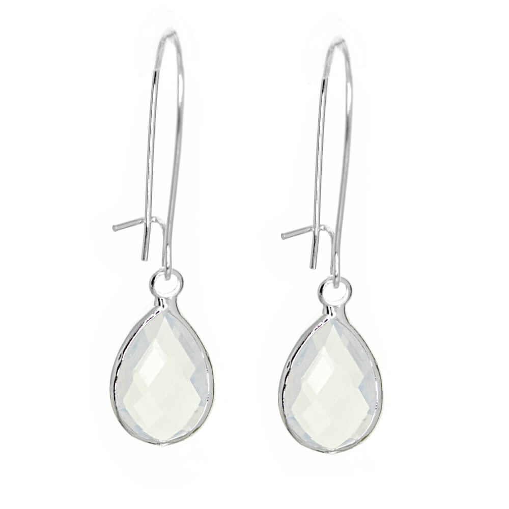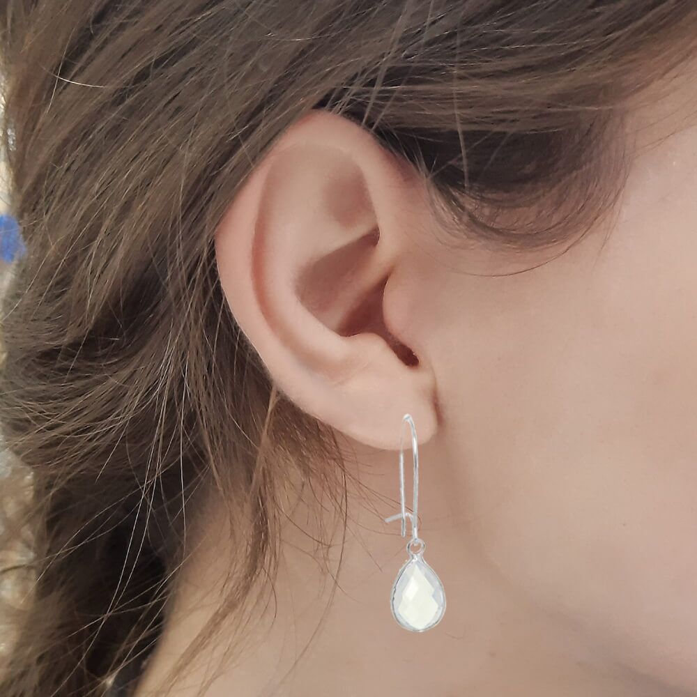A beautiful pair of faceted stone teardrops on long hooks that clip closed behind the ear