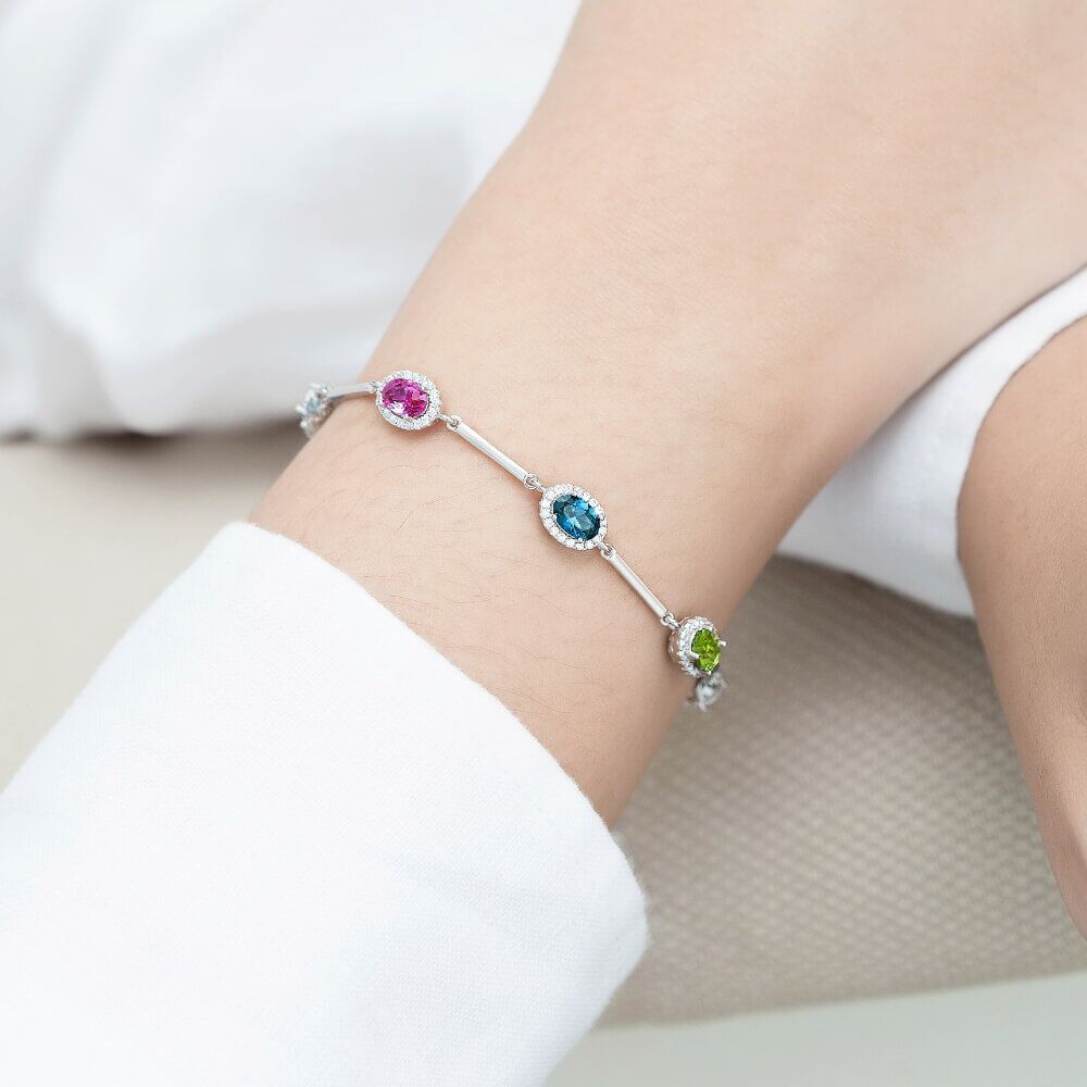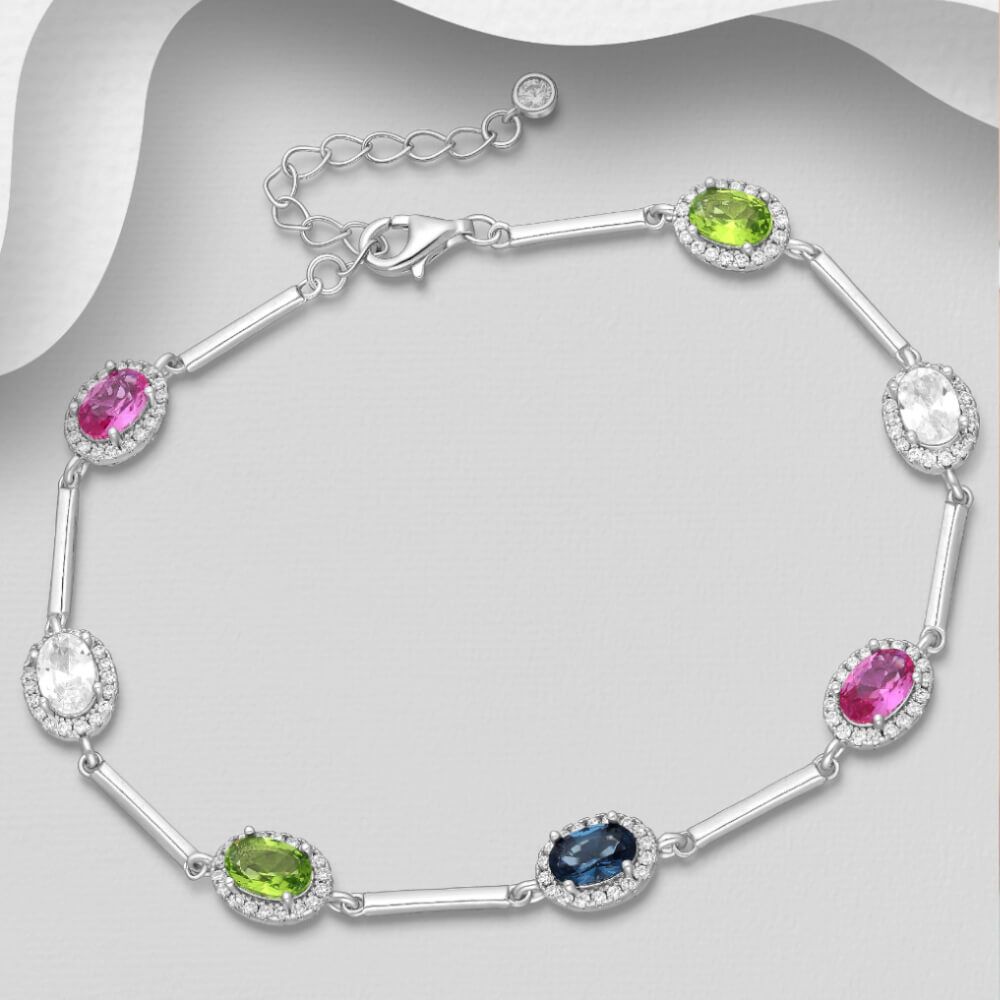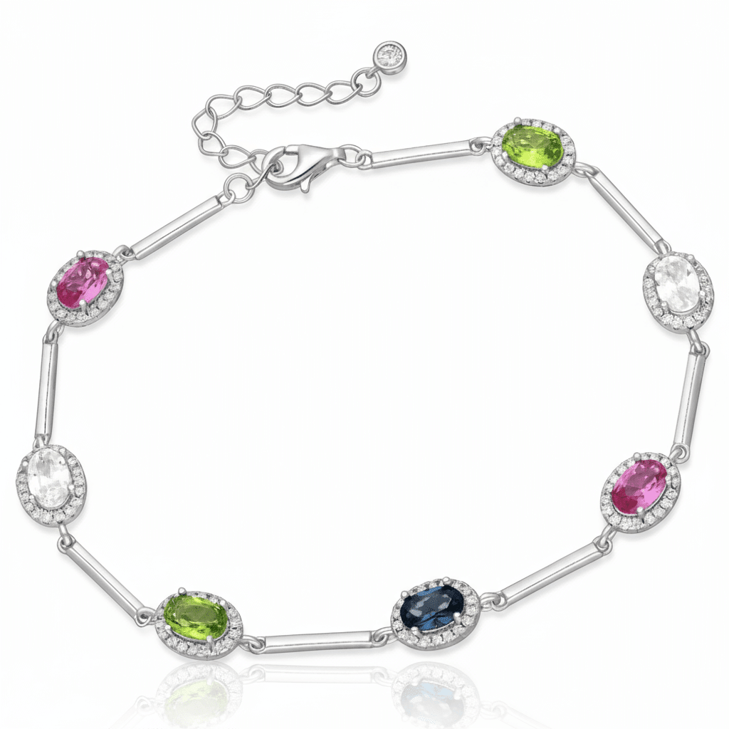 A striking and fun bracelet with bold colourful cz crystal oval shapes surrounded by halos made up of tiny crystals.