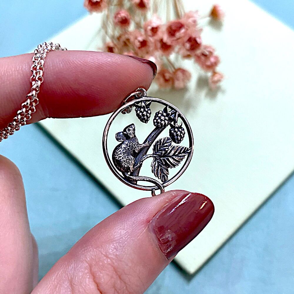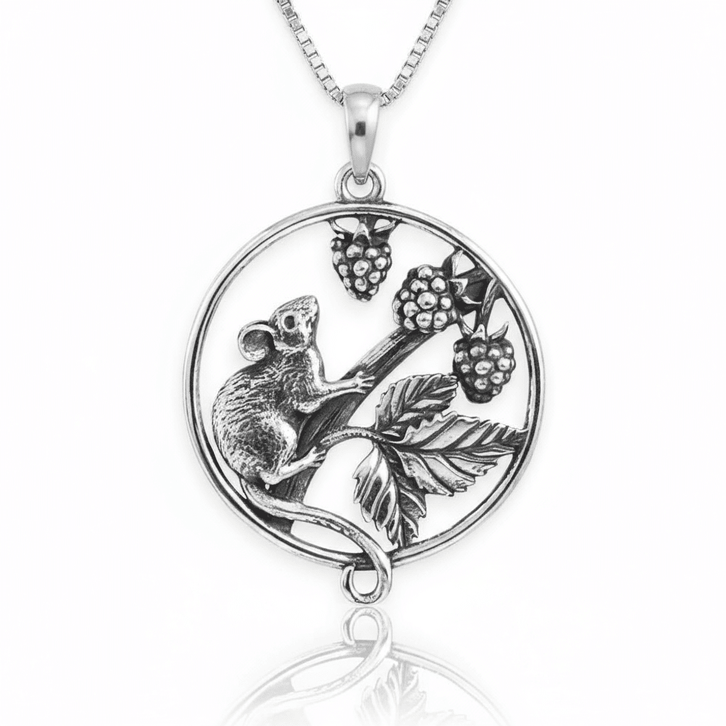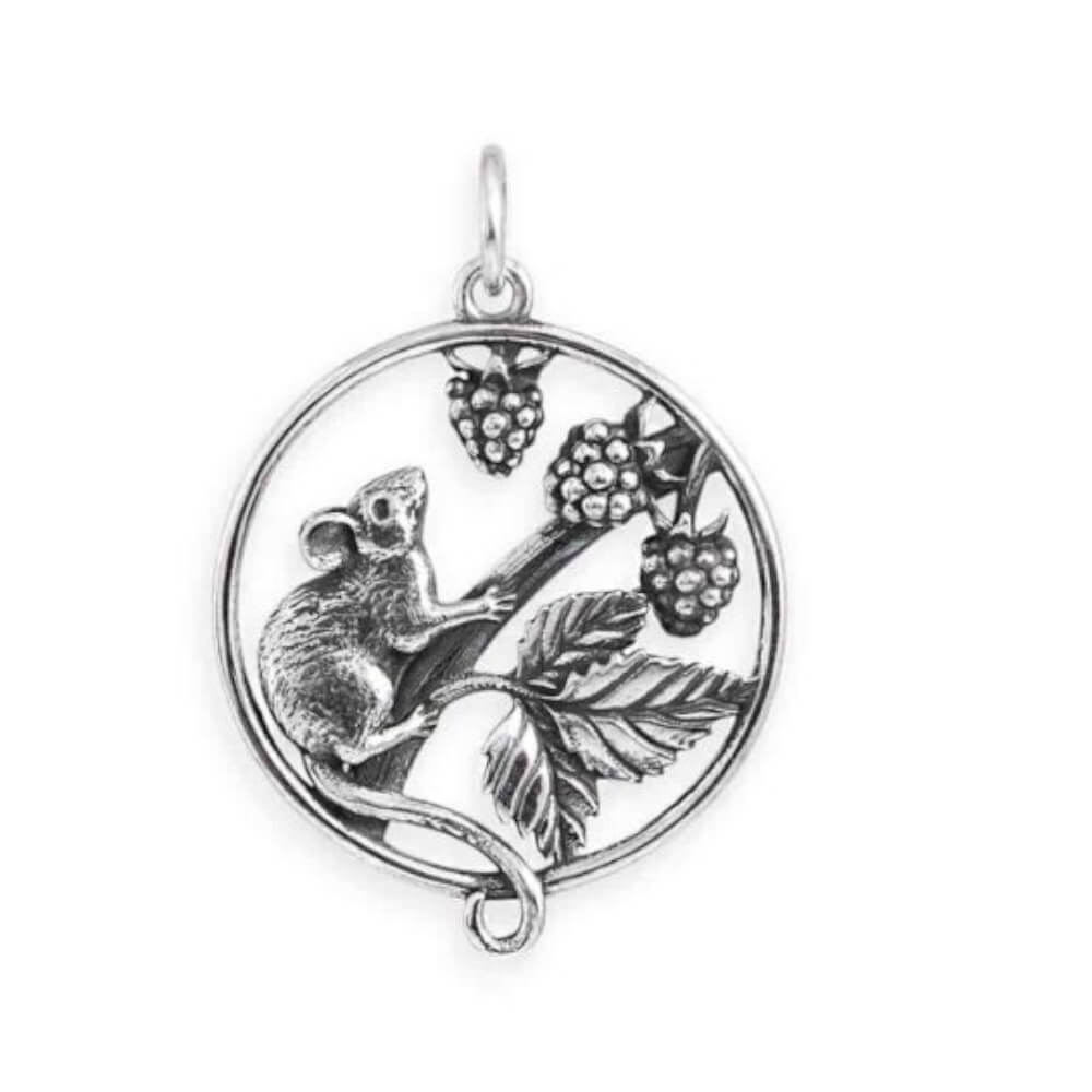 Celebrate the magic of the woodland with this intricately detailed sterling silver charm. Encased within a circular frame, a delicate little mouse is perched on a blackberry branch, surrounded by clusters of ripe berries and finely veined leaves. The charm’s design is rich with texture and depth, from the mouse’s soft fur to the plump berries and curling stems, capturing a serene moment in nature. A perfect nature inspired pendant for cottagecore and autumn lovers.
