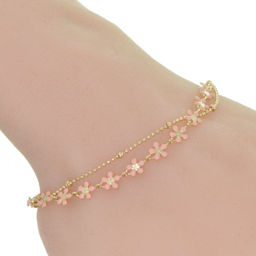 A simple and striking bracelet with two layers, one a row of flowers in white enamel, and the other simple tiny beads.