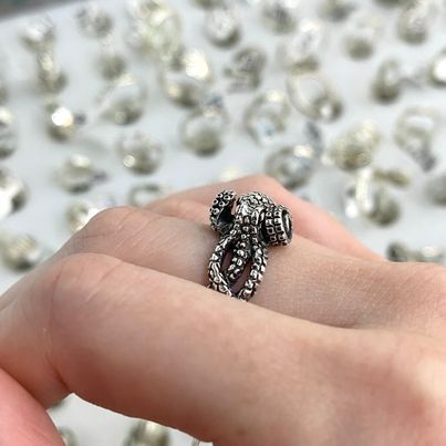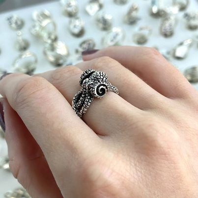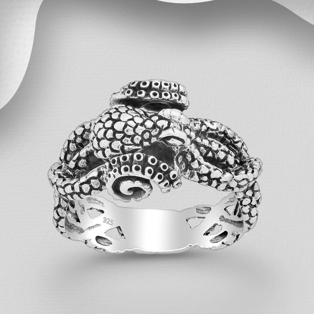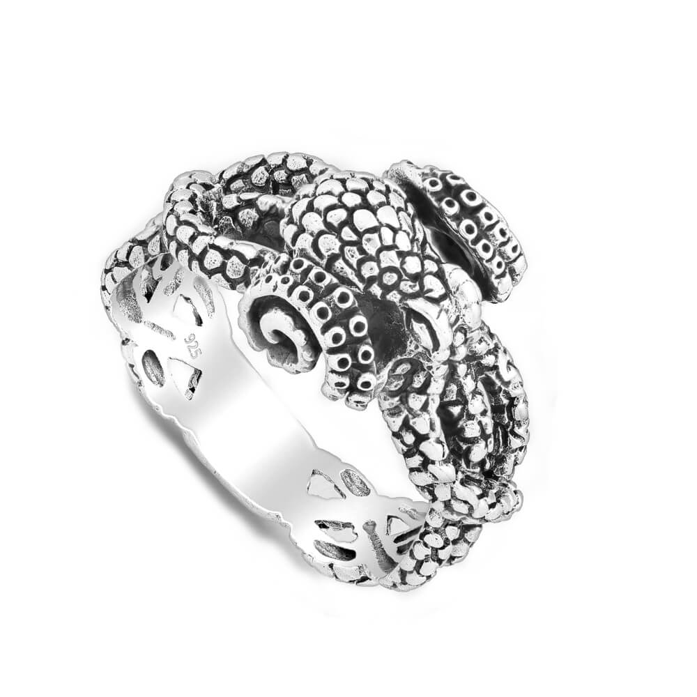 This gorgeous ring features a chunky kraken design, with tentacles that wrap around the band of the design. Details are picked out in blackened oxidised silver, though the underside is smooth and shiny silver.