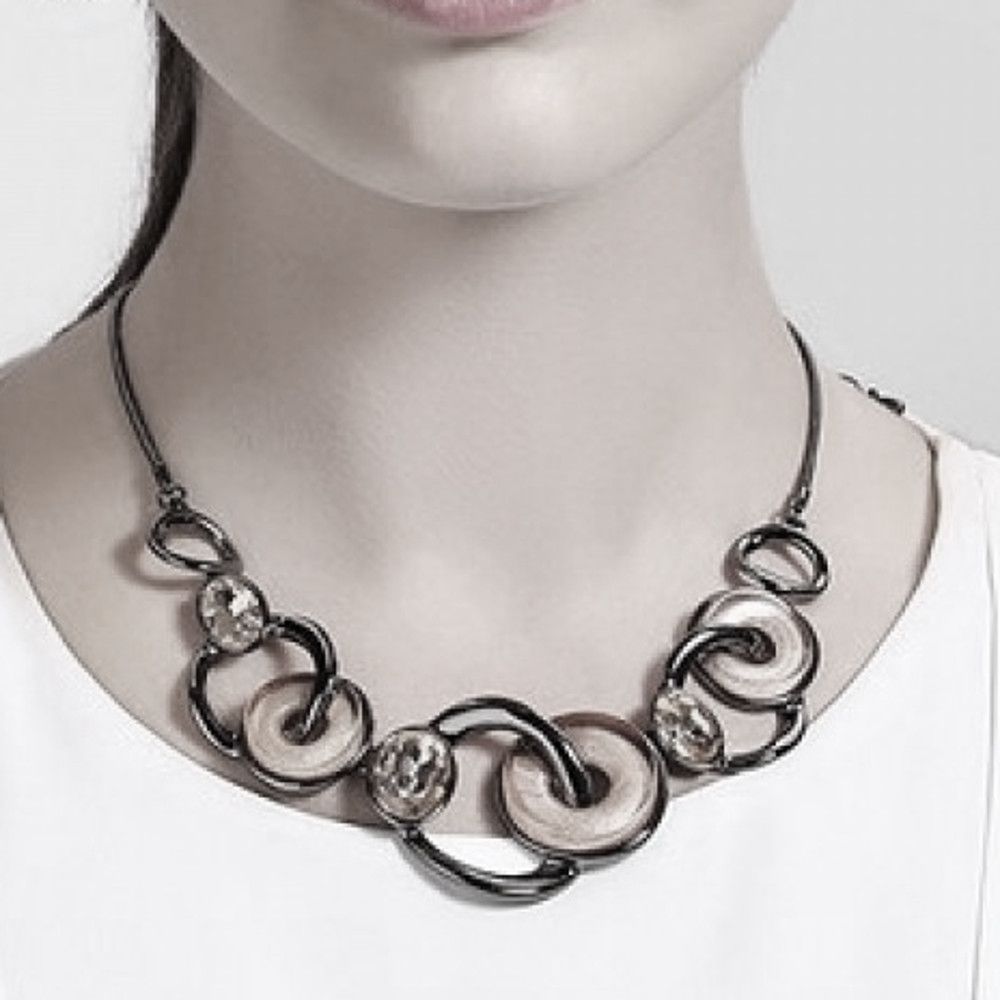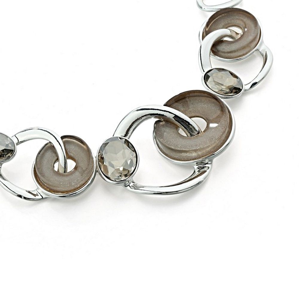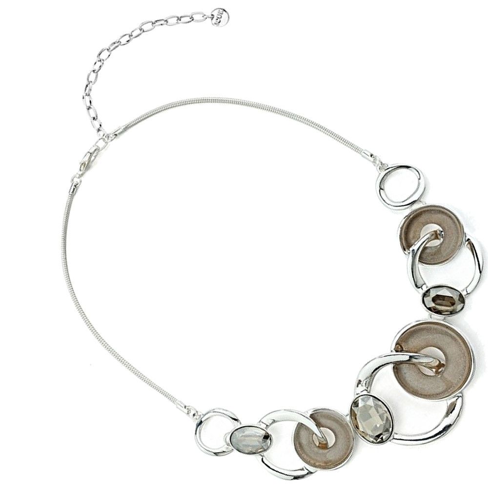 The necklace design features oval shaped crystal stones, bent silver circle outlines and chunky champagne tone taupe loops with a subtle internal shimmer. This sophisticated design looks great with day and evening looks.