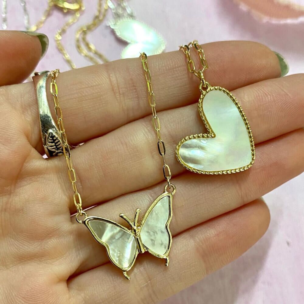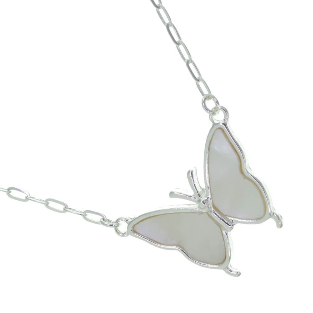 A simple and pretty necklace with lovely butterfly pendant design with iridescent shell inlaid in the wings.