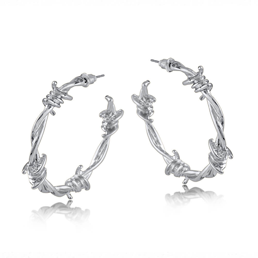 These unique silver or gold plated hoop earrings feature barbwire details. A statement piece that can be worn alone or with smaller hoops. At least 50% of the brass used in the jewellery we make is recycled from leftover/overhead brass. All posts are hypoallergenic made from surgical steel.