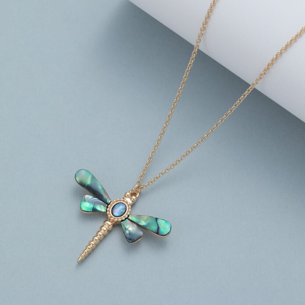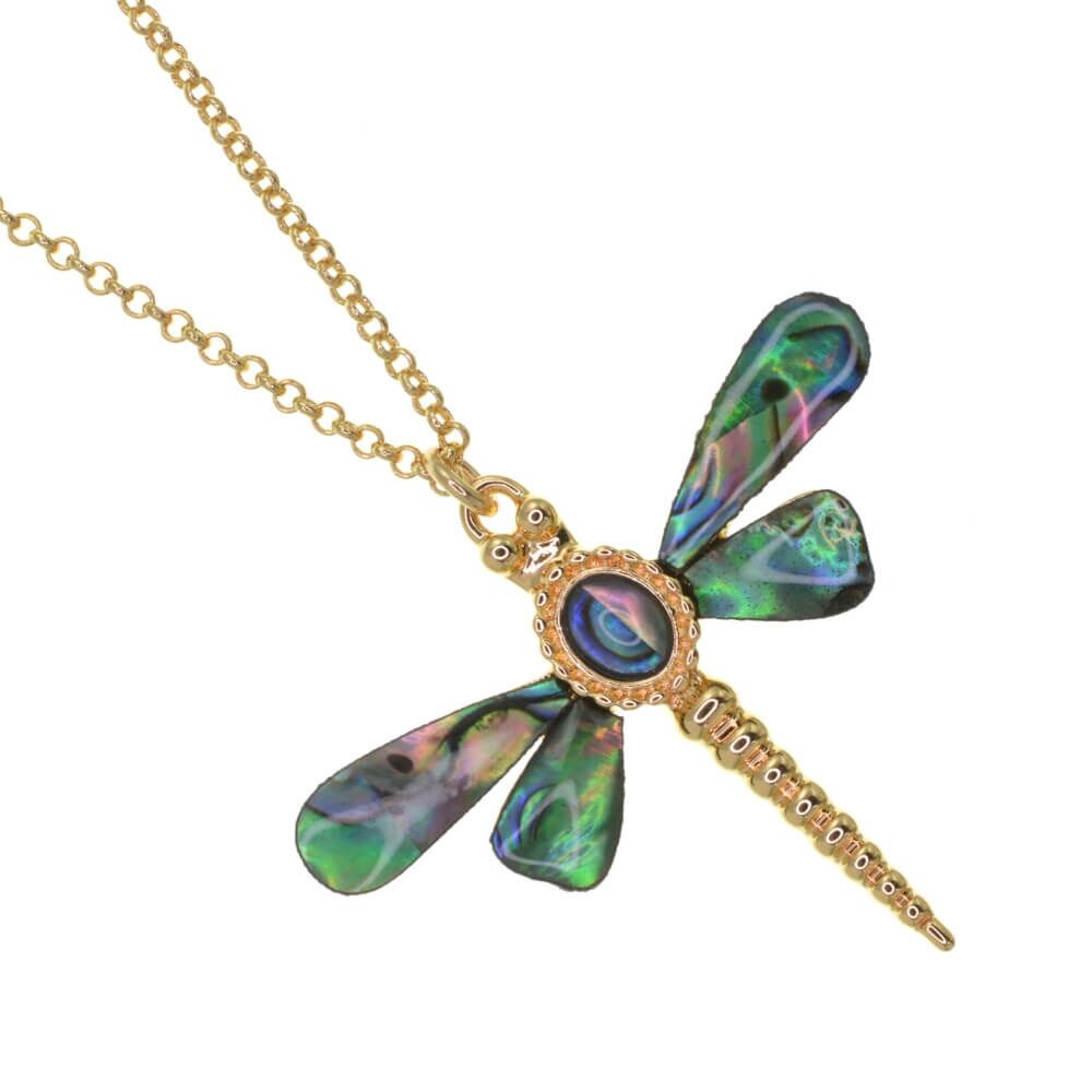A striking dragonfly design with iridescent abalone shell wings in shifting blue and green hues.