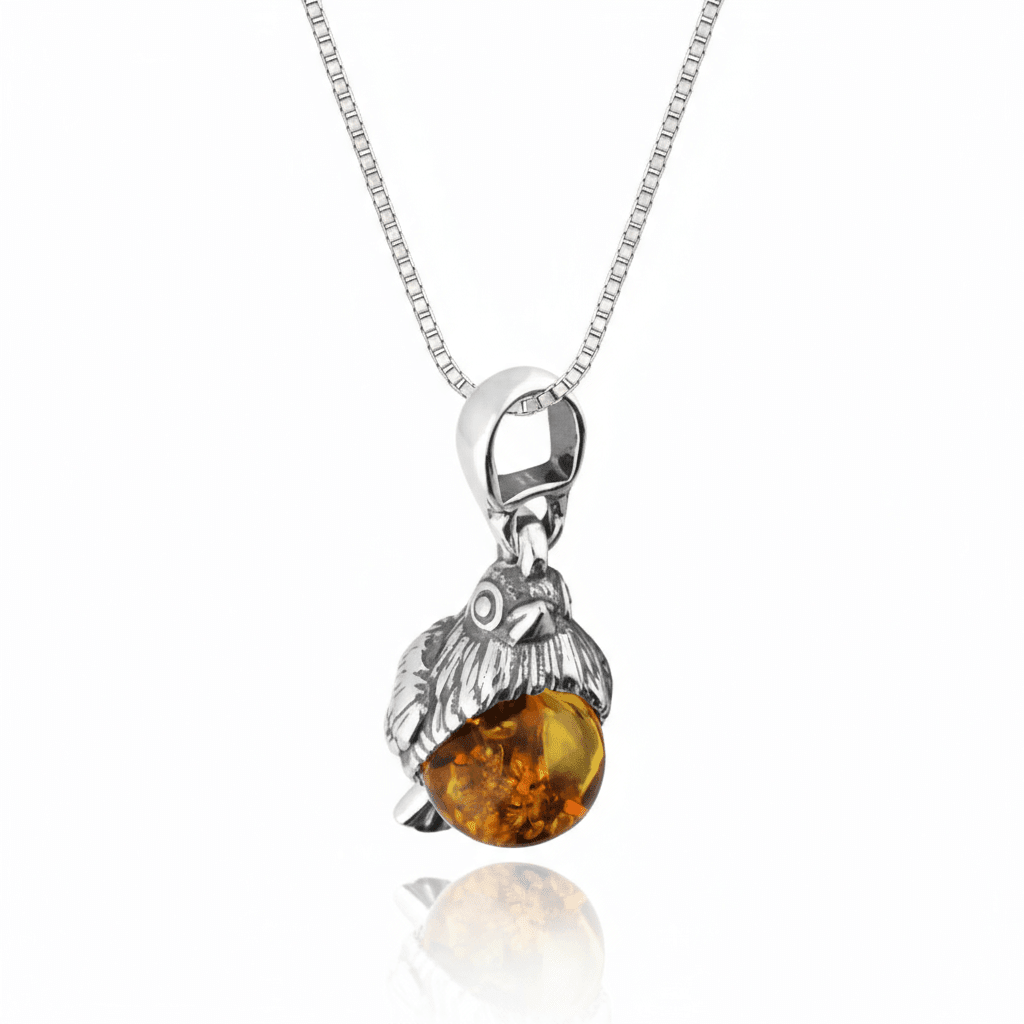 A gorgeous small robin pendant perfect for christmas and all year round! The red breast detail is created with a beautiful cognac amber stone.