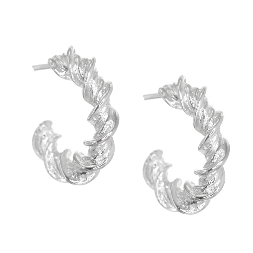 A striking pair of chunky hoop earrings with a contemporary twisted design. these fasten with studs and are a three quarter hoop.