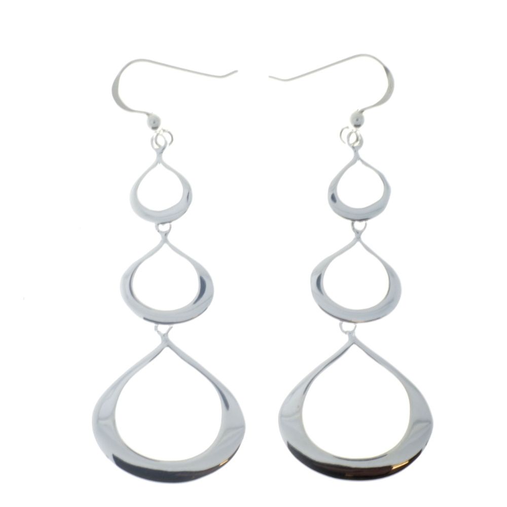 A modern pair of statement earrings with three linked teardrop shapes for easy elegance.