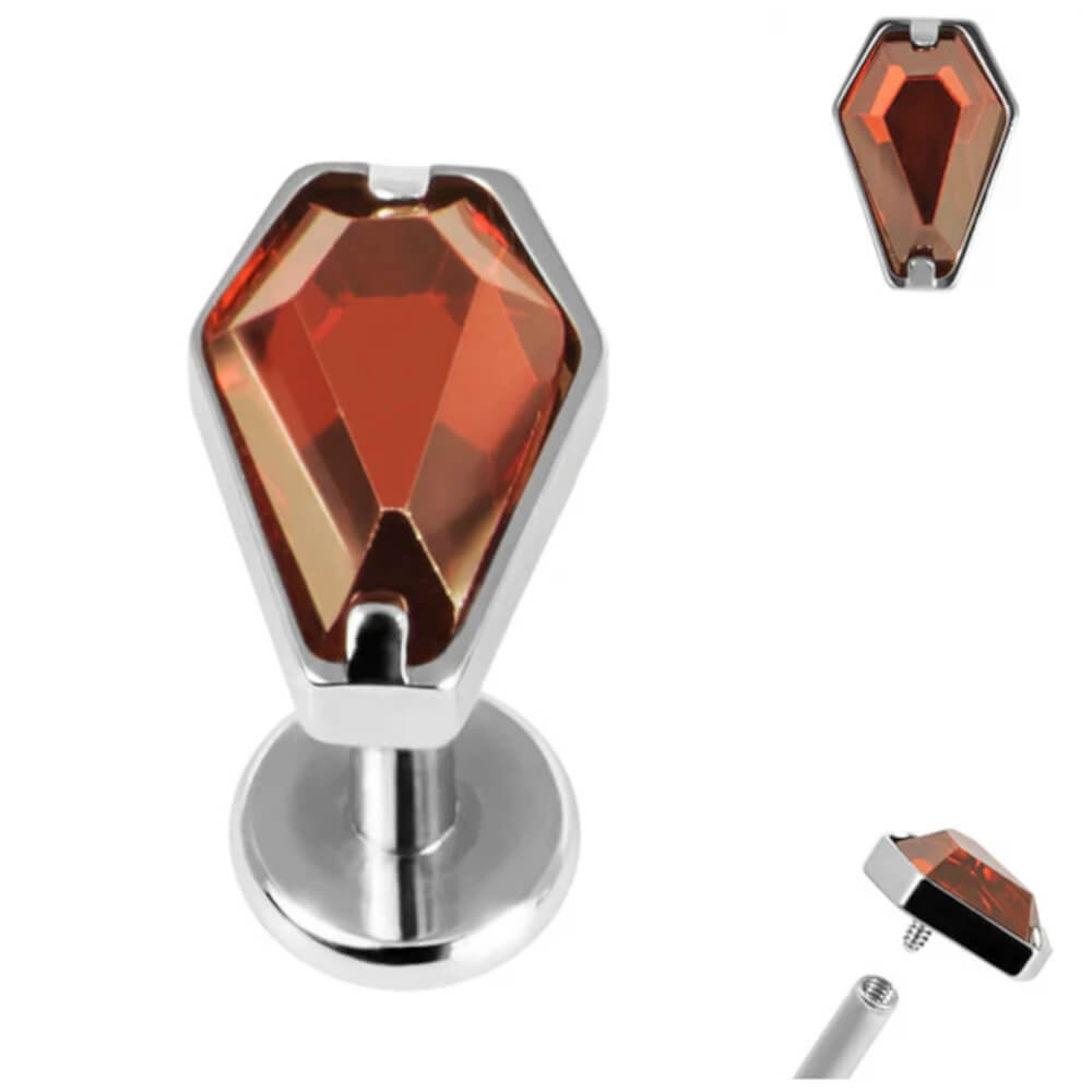 Titanium Claw set jewelled Coffin Shape. Available in Mirror Polish Titanium with a Red Jewel. This top is approximately 4.7mm wide and 6.8mm high. Supplied on a Titanium Internally Threaded Labret in 1.2mm gauge.