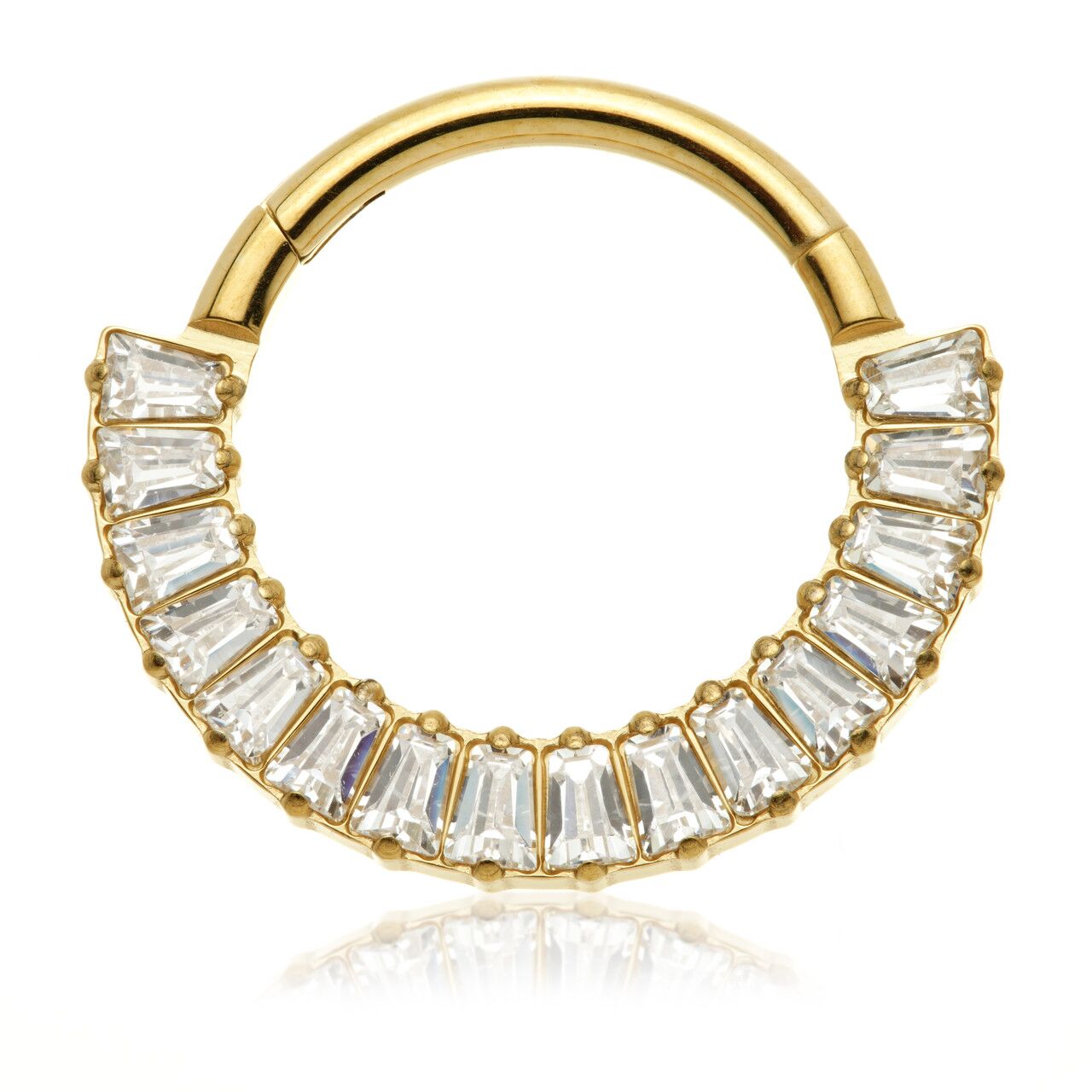 This sparkling half jewelled pave clicker ring feature front facing crustal baguette gems and an easy to use hinged opening that clicks shut for a secure closure. These are great for piercings like Septum, Daith, Helix etc.