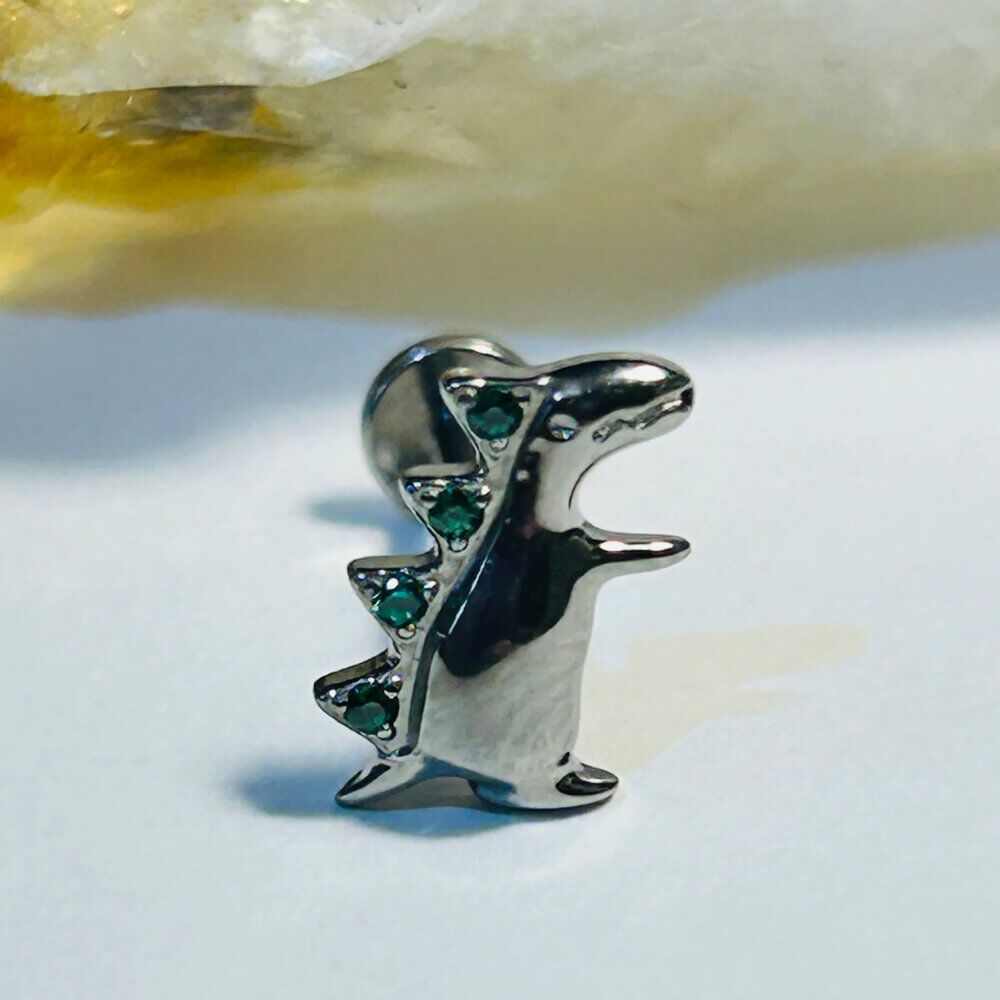 A beautiful and unusual dinosaur design with green gems dotted along the spines of it;s back.
