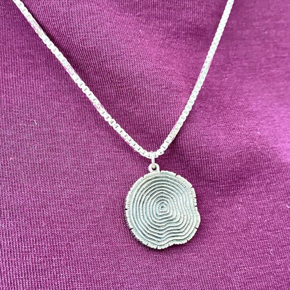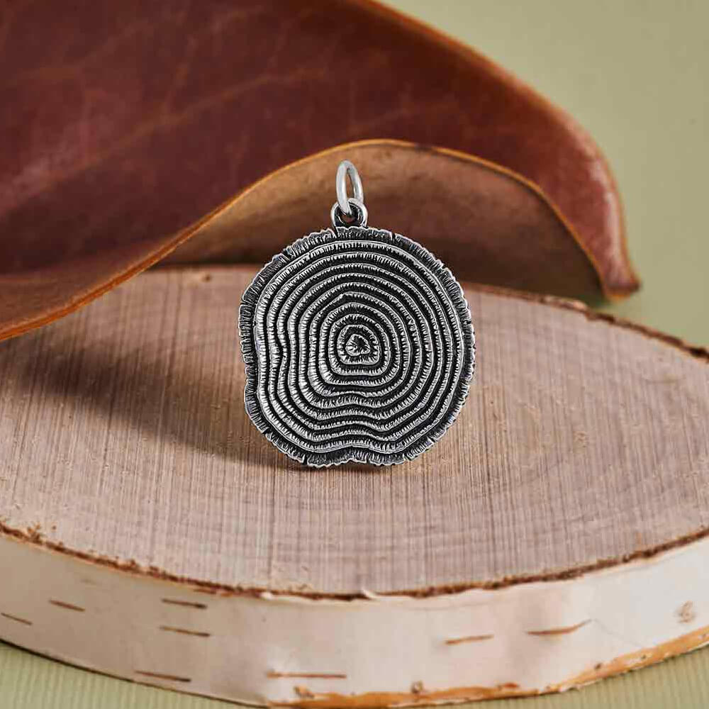 This beautiful tree crosssection pendant depicts the passing of time through the many concentric rings of the tree trunk. This charm tells a story of endurance, wisdom, and life’s continuous growth.The expertly crafted grooves and textures capture each layer of the tree’s journey, symbolizing personal jewellery.